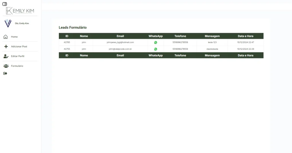 • Gestão de Leads: Visualize em formato de tabela os contatos recebidos pelo site, preenchidos via formulário. Assim, é possível acompanhar solicitações de clientes potenciais de maneira organizada e eficiente.