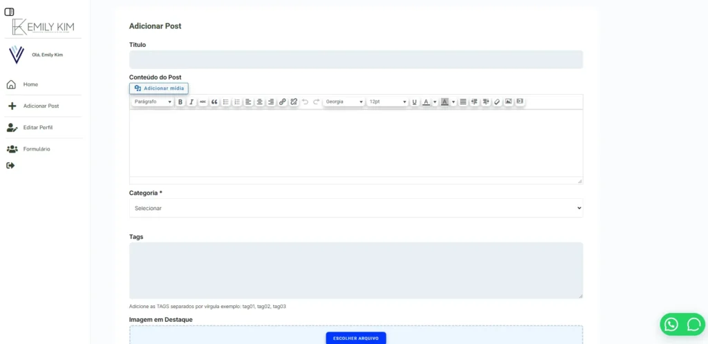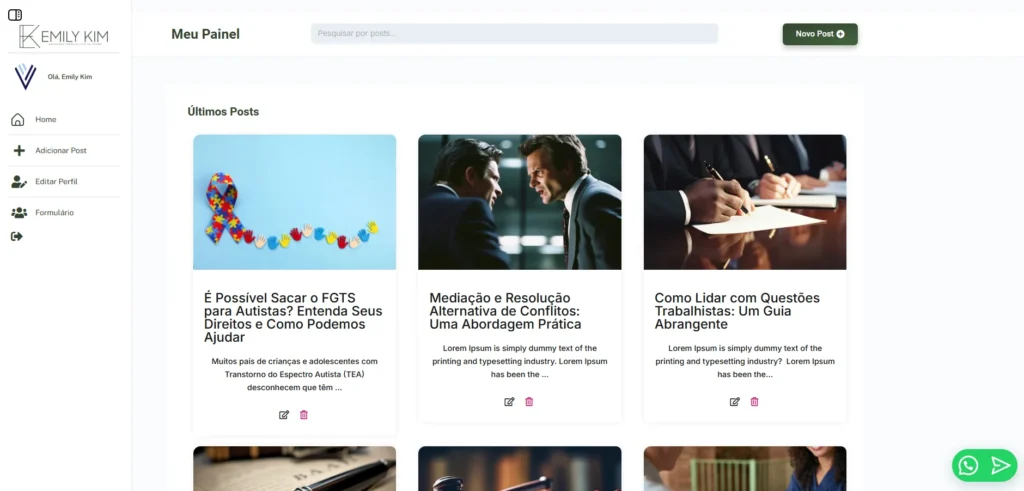 • Gestão de Posts: Adicione, edite ou exclua posts diretamente pelo painel. Cada publicação pode conter uma imagem de destaque, outras imagens dentro do conteúdo, título, categorias (cards) e mais.